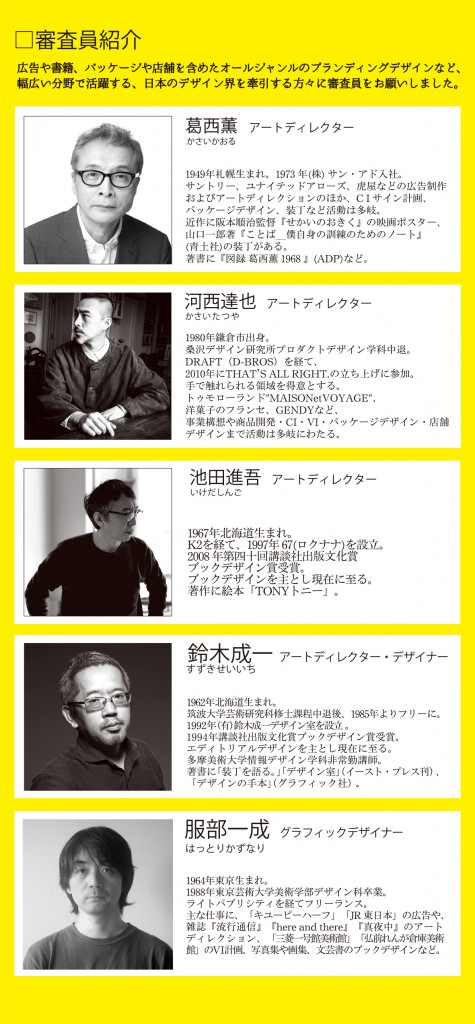 本年も、広告や書籍、パッケージや店舗を含めたオールジャンルのブランディングデザインなど、幅広い分野で活躍する、日本のデザイン界を牽引する方々に審査員をお願いしています。