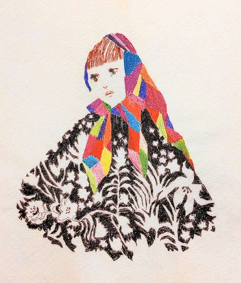 刺繍で描かれたとは思えない、多彩で美しい作品です。女性の表情も素晴らしく、思わず見入ってしまいました。線と色面が絶妙なバランスで一枚の絵に収まっており、心を奪われました。