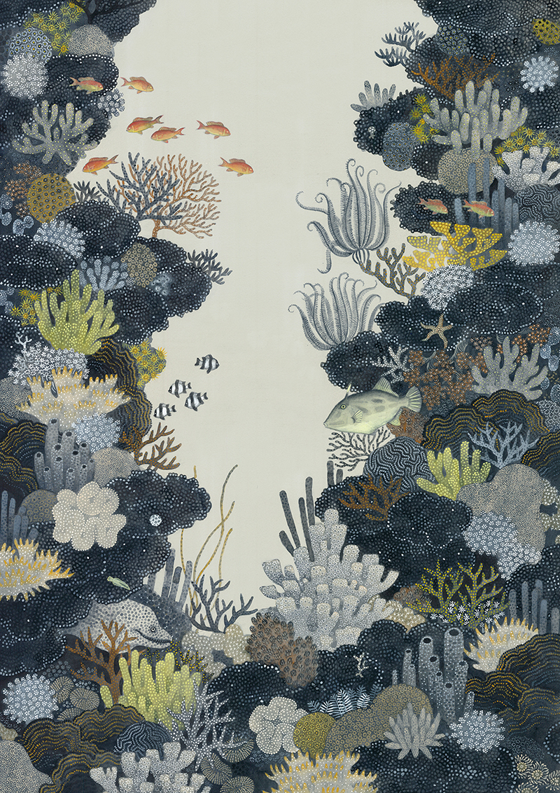 昨年応募してくださったゆるやかな作品もいいなと思っていたのですが、 今年はよりモチーフや色使いが明確になり、 さざなみのような渦潮のようなテクスチャがさらに効果的に感じたのと、 仕事へのイメージにも繋げやすかったので選ばせていただきました。 このテクスチャが生きるようなモチーフの装画をぜひお願いしたいと思いました。
